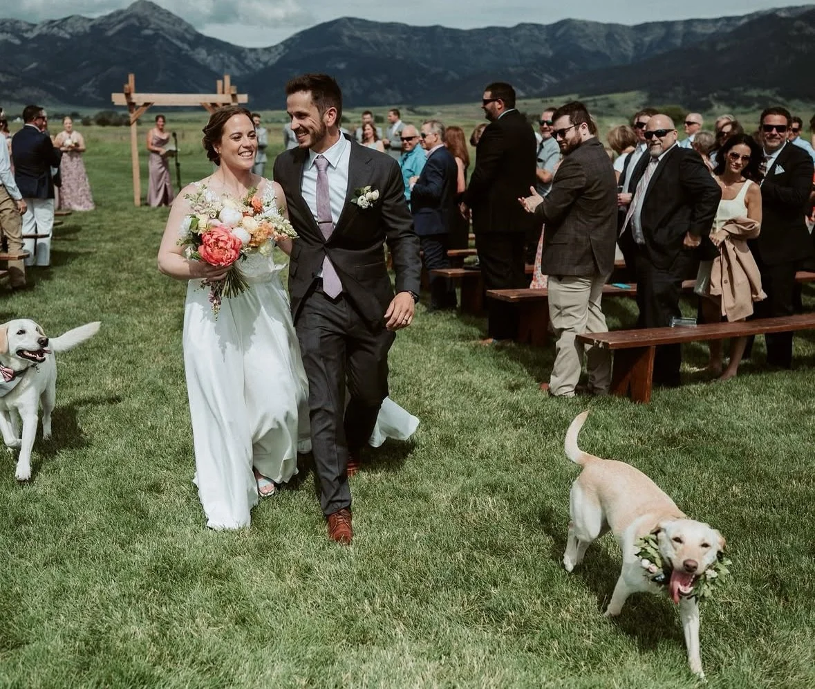 Wooden triangular wedding arch decorated with local flowers, set in a grassy outdoor field with trees and Montana mountains in the background.